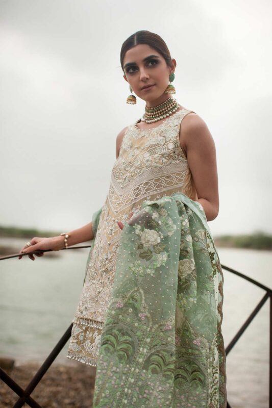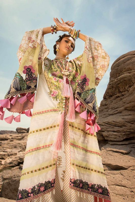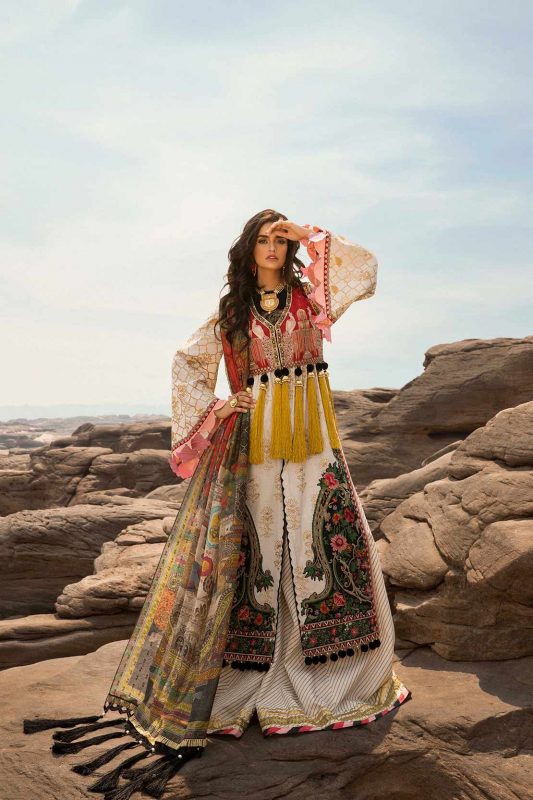 Crimson Luxe Embroidered Chiffon Unstitched 3 Piece Suit – CL18-3A Mehraab Buttermilk