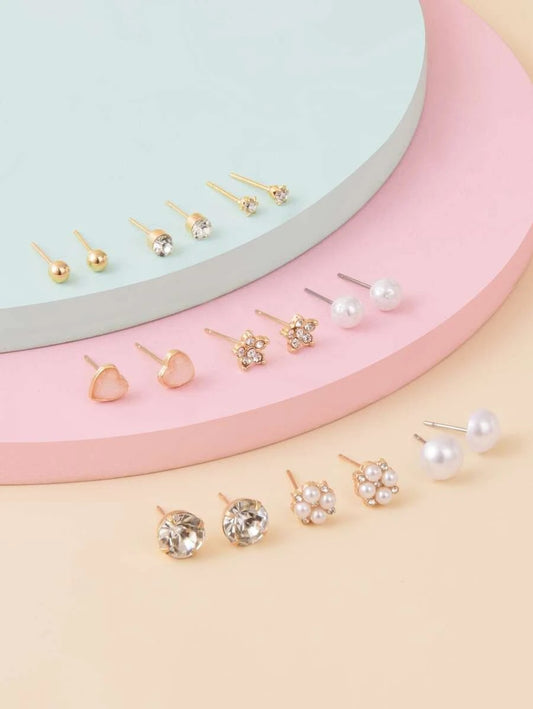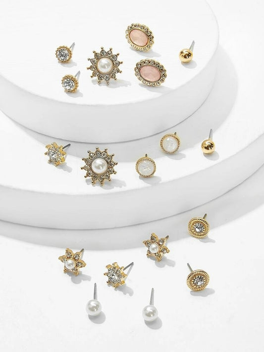 Rhinestone Decor Flower & Faux Pearl Stud Earrings 9pairs - HDJ 029