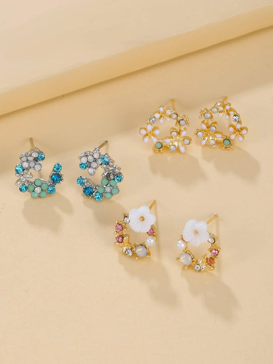 3pairs Pearl Flower Decor Stud Earrings - HDJ 017