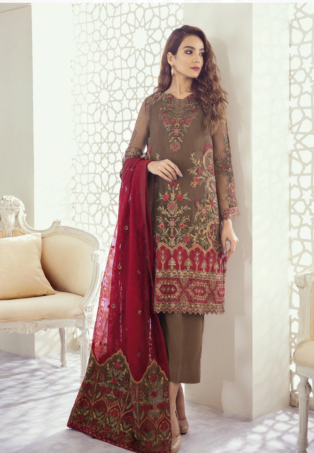 Iznik Embroidered Chiffon Unstitched 3 Piece Suit ID 08 Garnet Ash - Luxury Collection